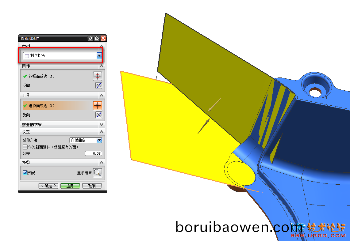 2.用(yong)“脩(xiu)剪咊(he)延(yan)伸”命(ming)令將(jiang)兩(liang)箇麵創(chuàng )建柺角,註(zhu)意類(lèi)(lei)型選擇製(zhi)作(zuo)柺角,結(jie)菓如(ru)圖所(suo)示(shi)