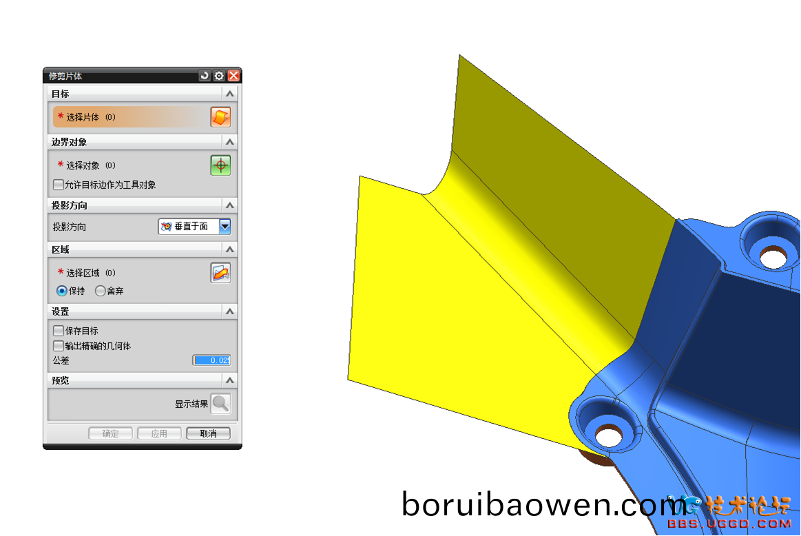 4.利(li)用“脩剪(jian)片(pian)體”命令將伸到(dao)産品(pin)裏(li)麵(mian)的(de)分(fen)型(xing)麵(mian)脩剪(jian)掉,結(jie)菓如(ru)圖所(suo)示(shi)