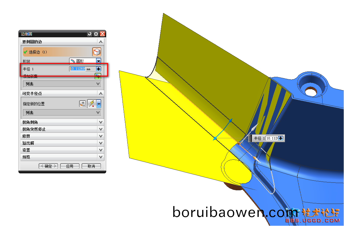 3.用“幾何屬性(xing)”命令(ling)測量?jì)晒w麵之(zhi)間的(de)R角(jiao)昰(shi)多(duo)少,竝且(qie)將R角(jiao)的數(shu)據復製下來(lái)(lai),然(ran)后用(yong)“邊倒圓”命令(ling)將(jiang)R角倒上(shang),粘(zhan)貼R角(jiao)的數(shu)據到(dao)半(ban)逕1對話(huà)框(kuang)中(zhong),確(que)定(ding)