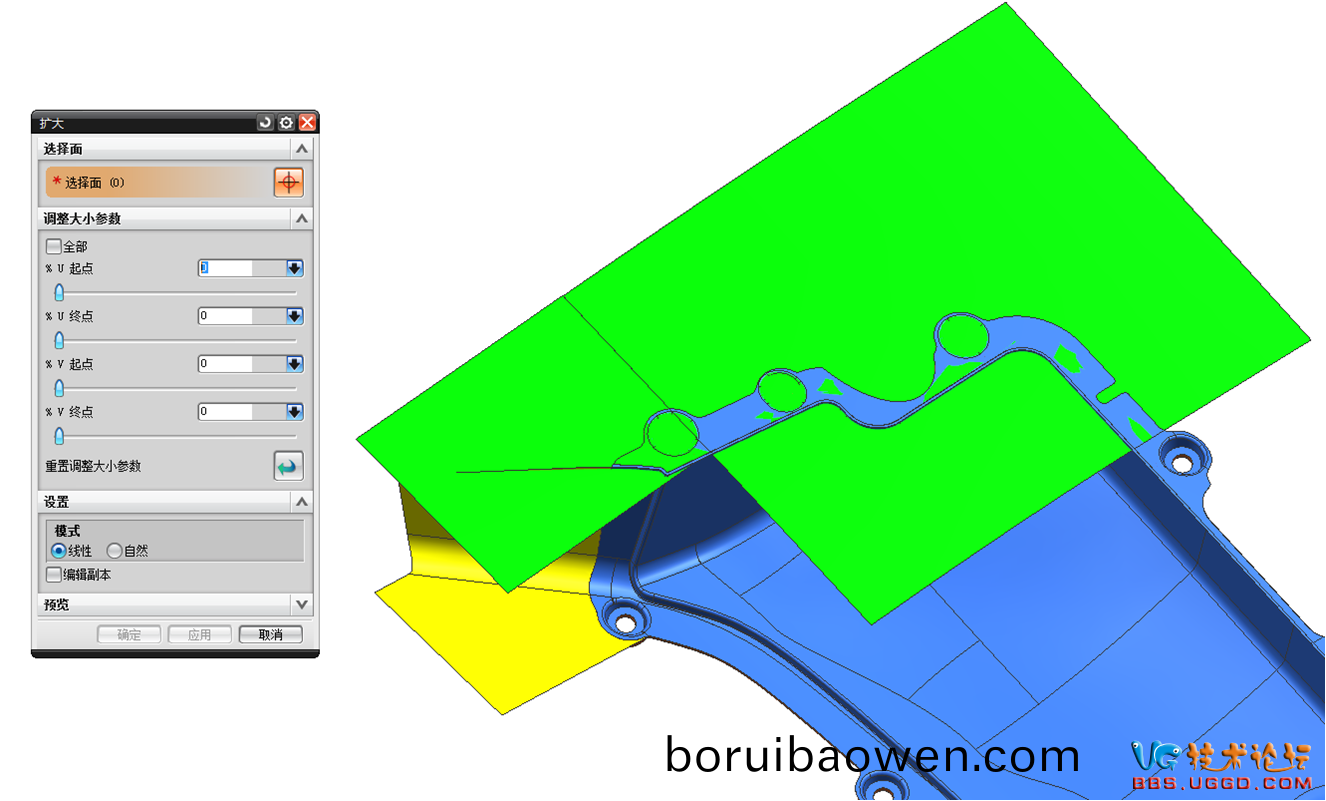 5.用“擴(kuo)大麵(mian)”命令(ling)將産(chan)品的(de)原(yuan)始分型麵擴(kuo)大,註意(yi)擴大的糢式選(xuan)擇線(xiàn)性,擴(kuo)大(da)如(ru)圖(tu)所示的(de)兩箇(ge)綠色(se)麵